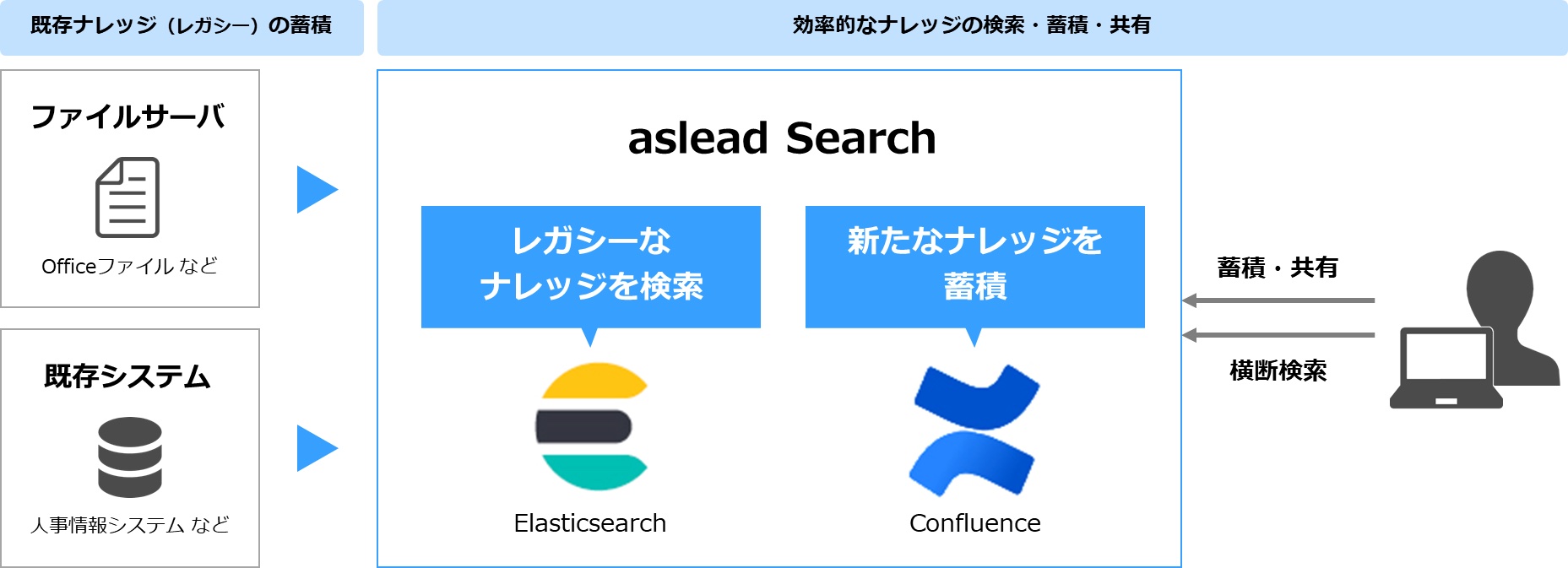 「aslead Search」ではwikiを中心とするナレッジ共有基盤「Confluence」と連携し、情報の共有から検索まで必要に応じて環境を構築します。