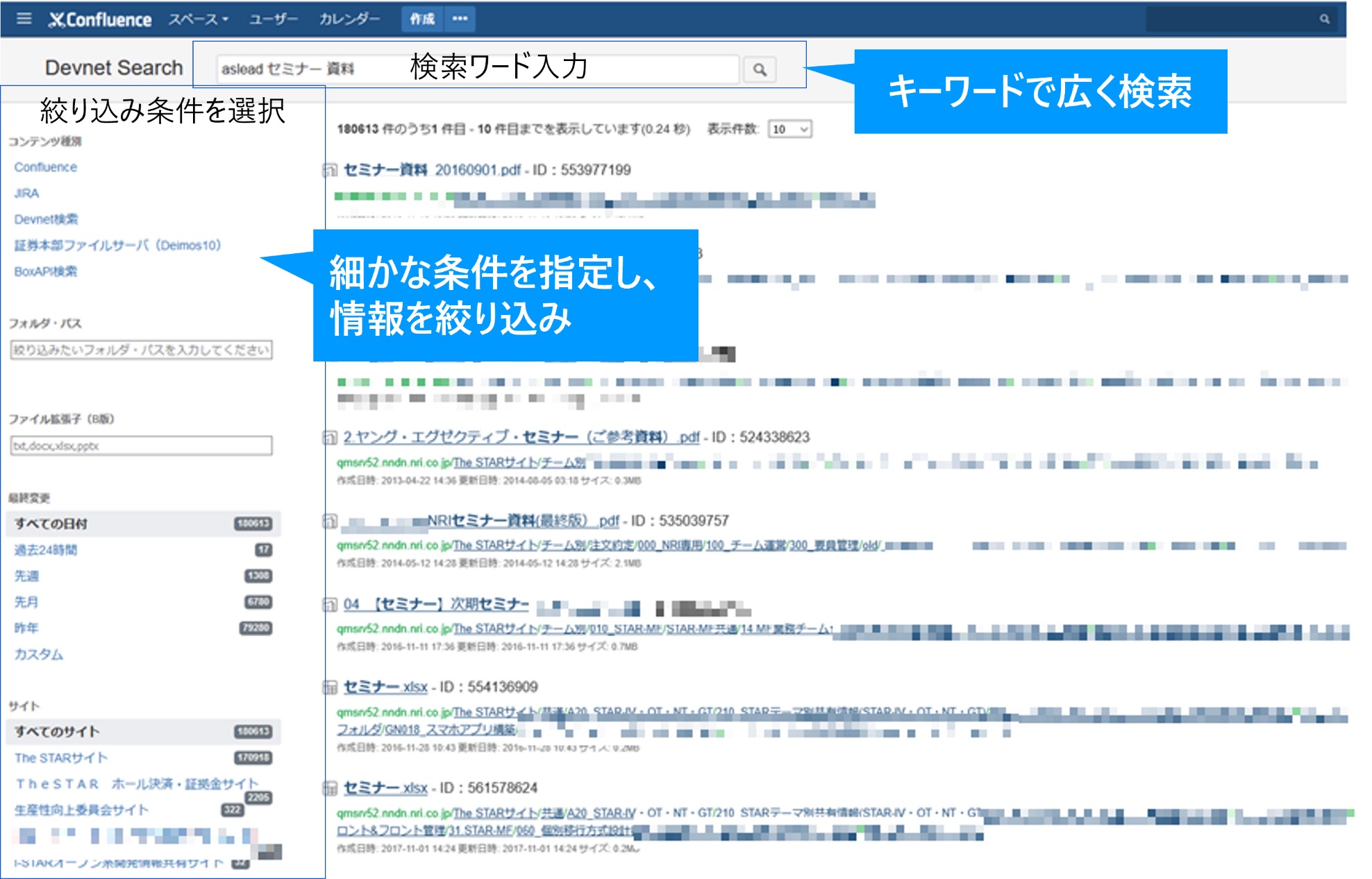 この問題を解決するために、すでに利用していた情報共有基盤である「Confluence」と連携する形で、 NRIが提供するエンタープライズサーチソリューション「aslead Search」を導入しました。