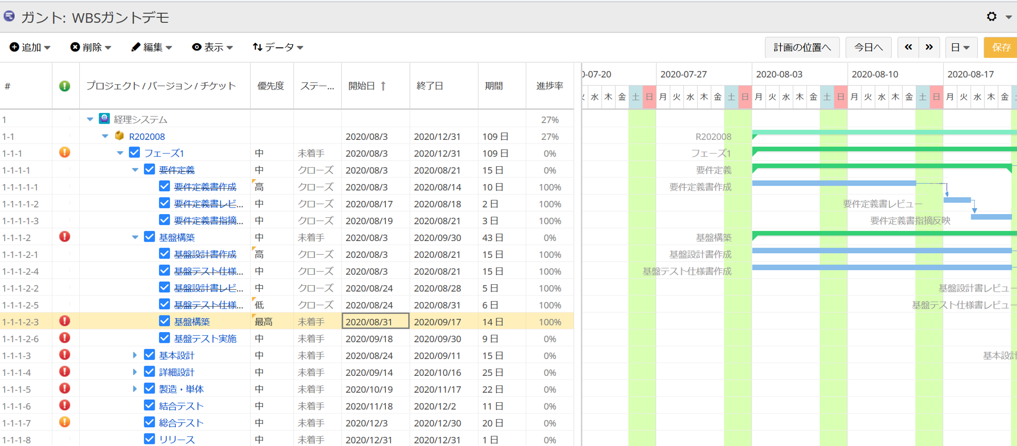 この製品で特徴的なのは、作業計画を統括する「課題(チケット)管理機能」です。チームの作業や問題を「課題」として作成し、メンバーをアサイン、リアルタイムで作業を可視化、プロジェクト内のメンバーと共有することができます。また、WBSを作成することで、プロジェクトの全体像とタスク間の関係性を見える化して、作業範囲を共通認識させることができます。
