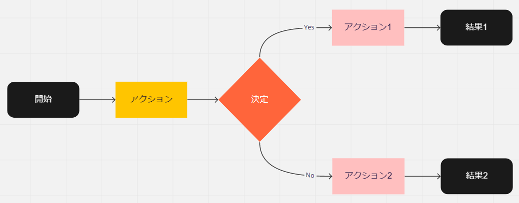 テーマに沿って、開始・アクション・決定(分岐)・結果のオブジェクトをコピー&ペーストしながら増やしていきましょう。