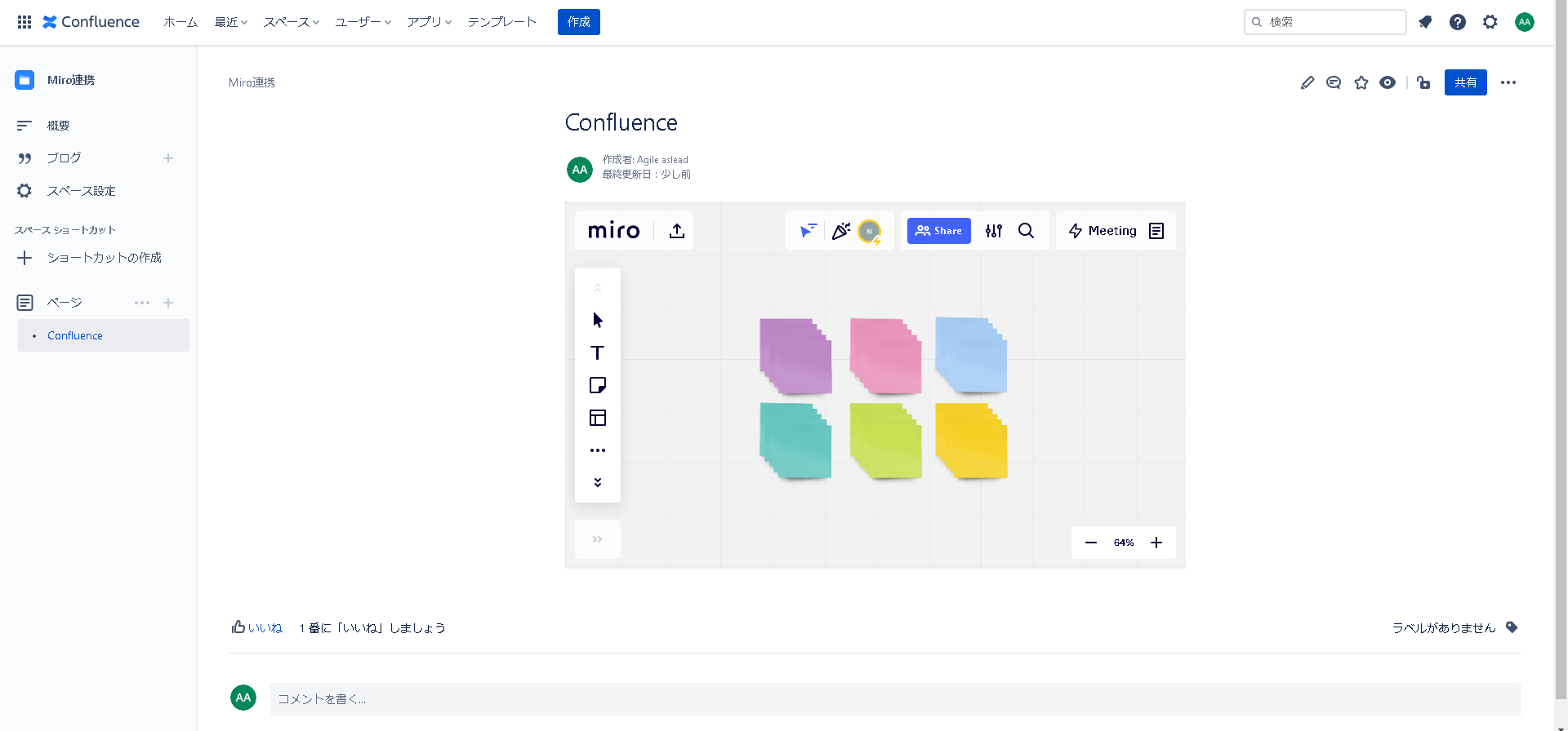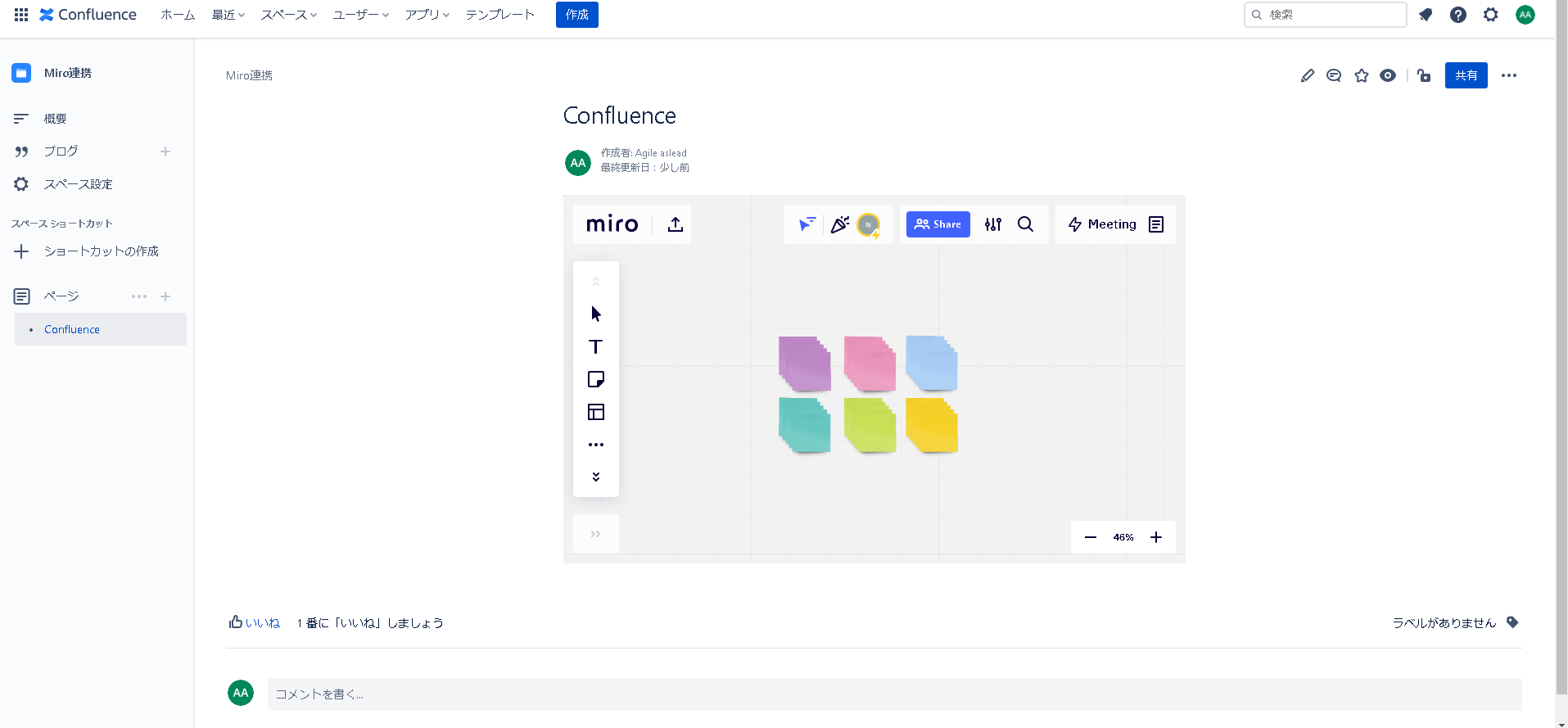 ConfluenceとMiroを連携すると、Confluence の Wiki ページに Miro のホワイトボードを貼り付けることが可能です。
