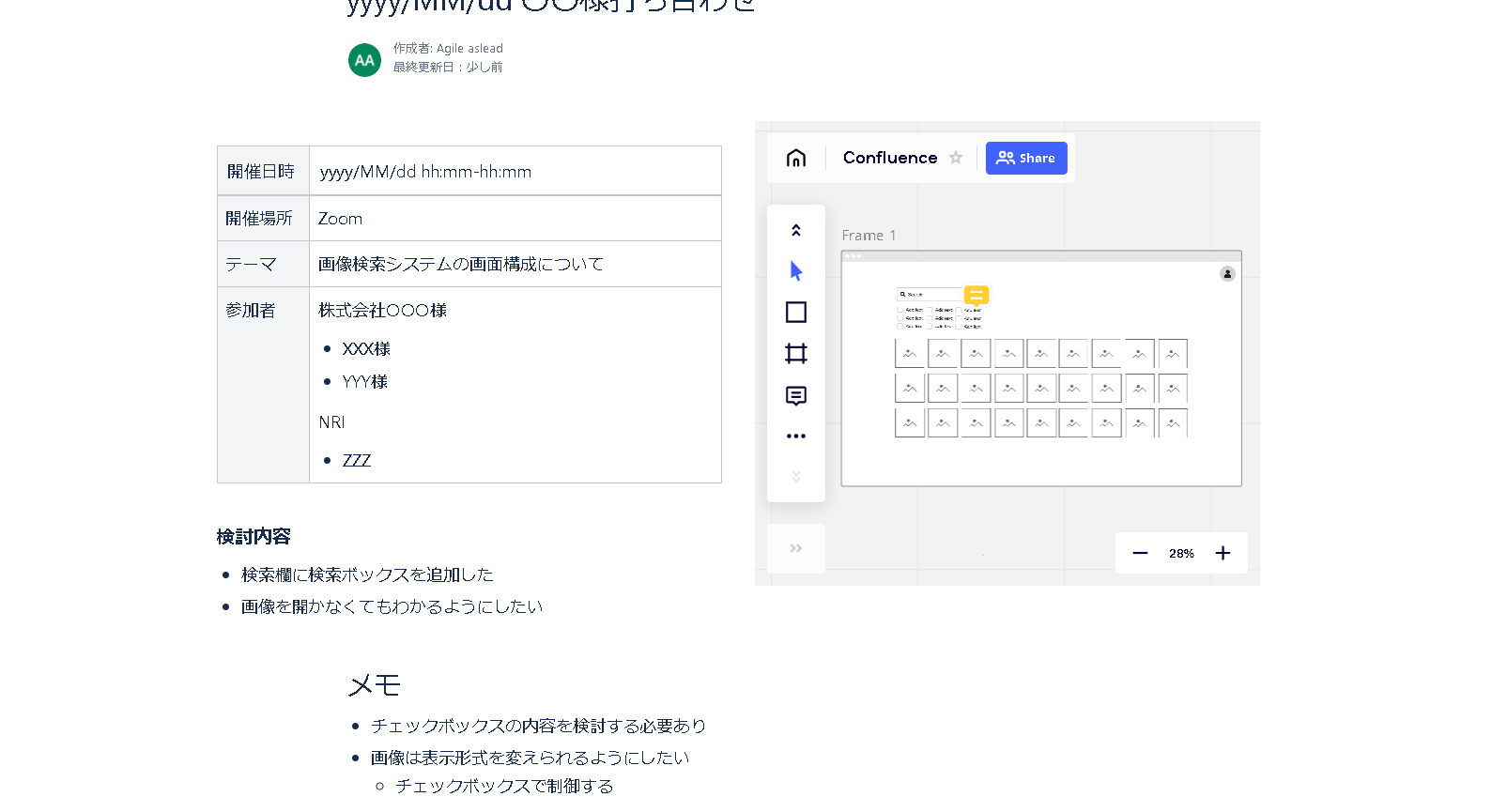 ConfluenceにMiroのホワイトボードを埋め込むことで、イメージの共有や編集を一回の打ち合わせの中で、完結させることができます。