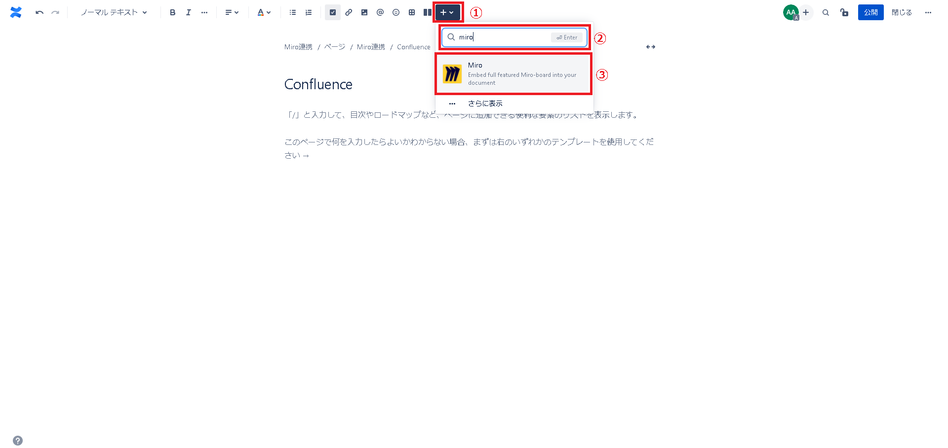 ConfluenceにMiroのホワイトボードを埋め込み、表示させる手順は以下の通りです。
